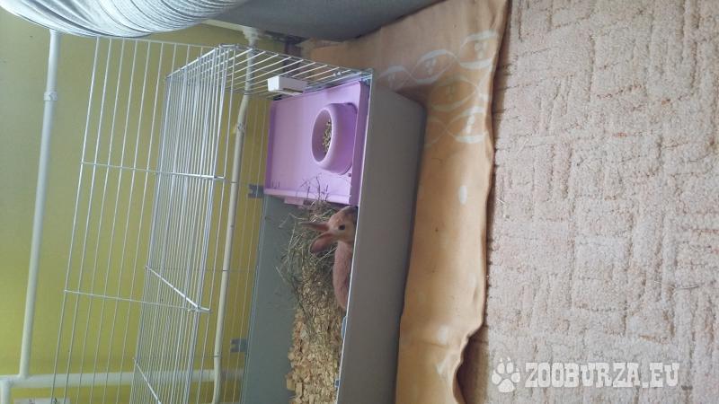 Popis: Daruji zakrslého králíčka (samečka) do dobrých rukou + vše co k němu patří: klec, přepravka, držák na seno (závěsná koule), atd...